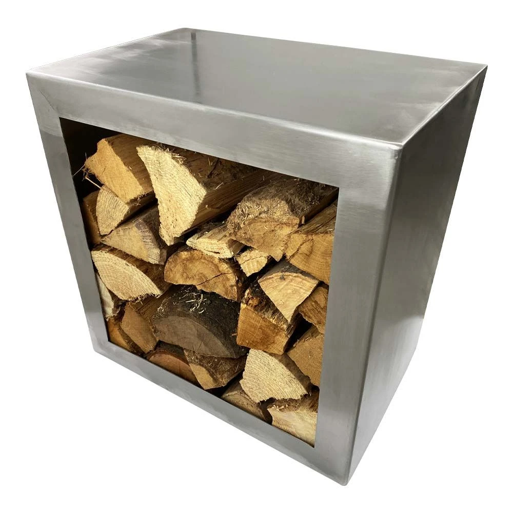 Unser Holzlager aus Edelstahl ist modern, funktionell und passt optisch in jede Situation. Die Tiefe vom Feuerholzregal ist auf die übliche Länge von Scheiten angepasst.