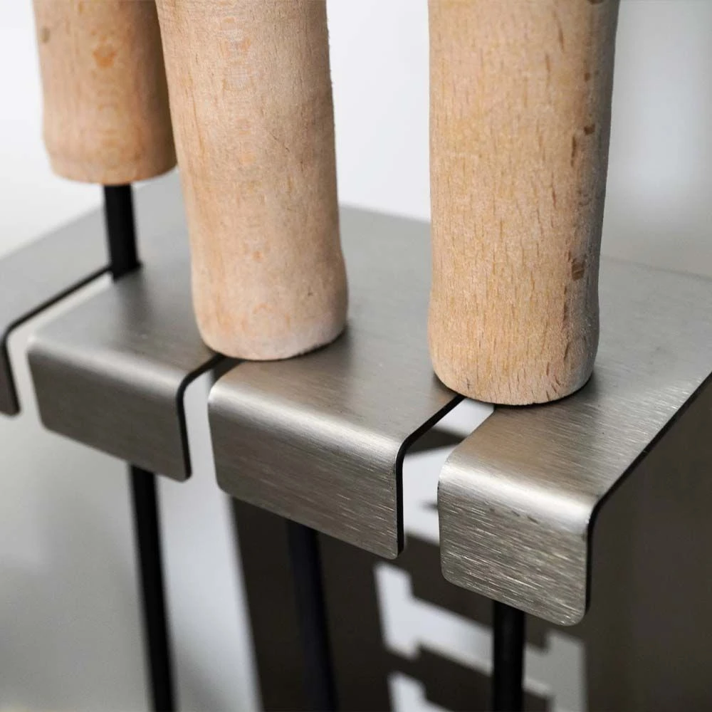 Unser Kaminbesteckset ist modern und funktionell. Gefertigt aus 2 mm Edelstahl wird er zum Hingucker für Ihre Feuerstelle. Das Set besteht aus einem Aschekratzer, einem Besen und Schaufel zum Zusammenfegen und Entsorgen von Asche. Alle Bestandteile lassen sich an dem Ständer aufhängen und sind dort stets griffbereit.